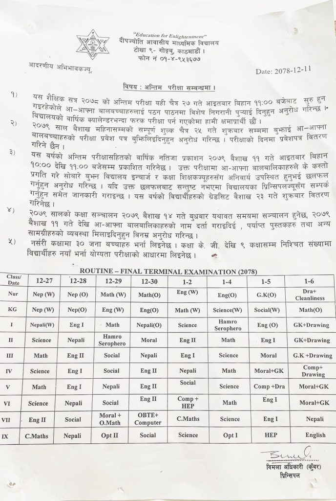 Final term examination of educational year 2078 schedule as follow. Please read notice properly before examination. Thank you.